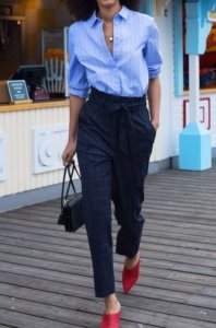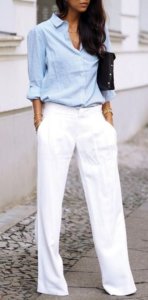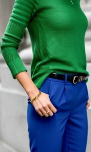 A kék szín biztonságos választás a fent felsorolt pozitív asszociációk miatt. A kék szín – elsősorban a sötét változata – alapvetően mindenkinek jól áll. Nem véletlen, hogy a „farmerkék” olyan közkedvelt, hogy szinte már nem is szín,hanem egy külön minőség. A kék színnek nincs erős figyelemfelkeltő jellege, így bátran viselhetjük olyan testrészen is, amit nem igazán szeretnénk hangsúlyozni, akár fekete helyett is jó választás lehet egy sötétkék, ha egy kis optikai karcsúsítást szeretnénk. A kék monokrómban kissé formális, egyenruha jellegű, de színekkel kombinálva életre kel!